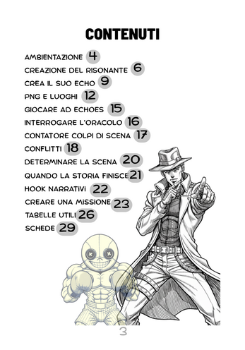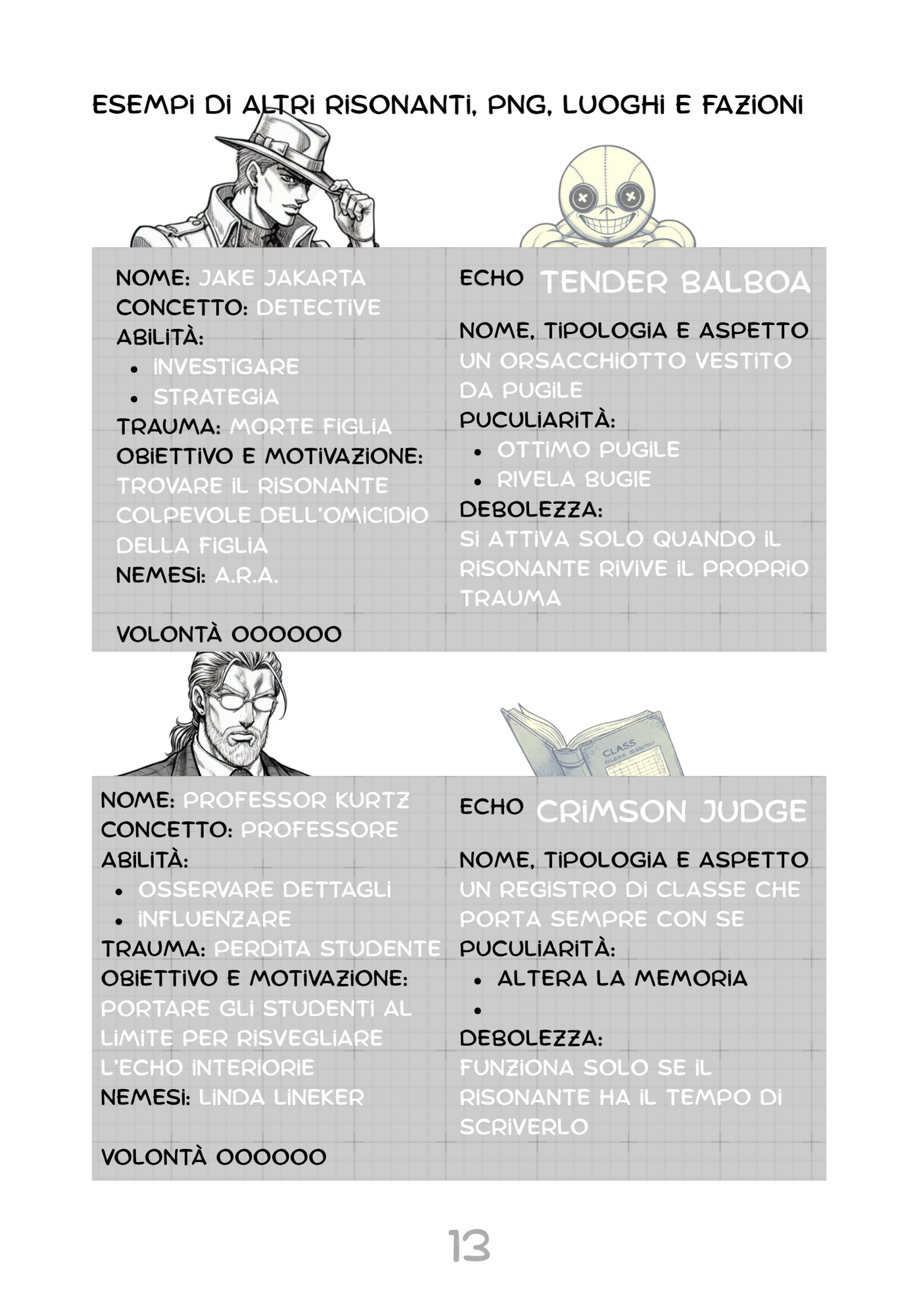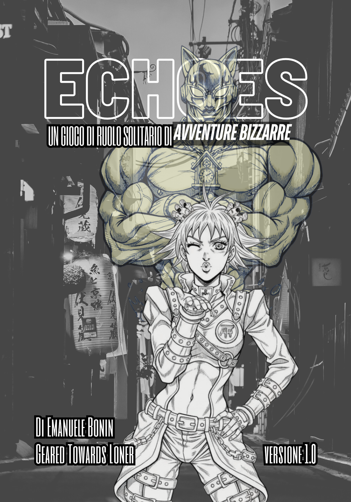 ECHOES è un gioco di ruolo in solitario di avventure bizzarre , fortemente ispirato a JoJo's Bizarre Adventure e costruito sul motore minimalista di Loner di Zotiquest Games.In questo gioco, dovrai navigare una società corrotta e affrontare misteri che sfidano la logica. Altri Risonanti useranno i loro poteri per inseguire ambizioni distorte , e potenti organizzazioni nell'ombra faranno di tutto per sfruttare le tue capacità.